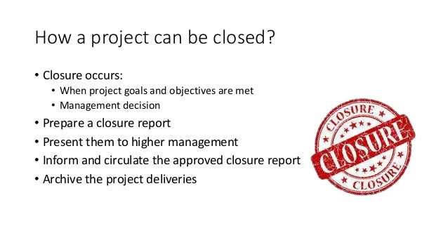 30. 30. How a project can be closed? • Closure occurs: • When project goals and objectives are met • Management decision • Prepare a closure report • Present them to higher management • Inform and circulate the approved closure report • Archive the project deliveries