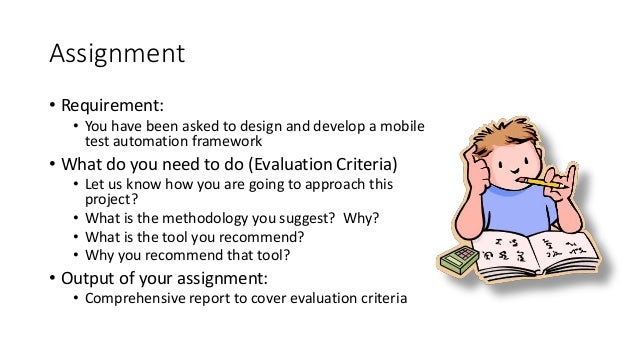31. 31. Assignment • Requirement: • You have been asked to design and develop a mobile test automation framework • What do you need to do (Evaluation Criteria) • Let us know how you are going to approach this project? • What is the methodology you suggest? Why? • What is the tool you recommend? • Why you recommend that tool? • Output of your assignment: • Comprehensive report to cover evaluation criteria