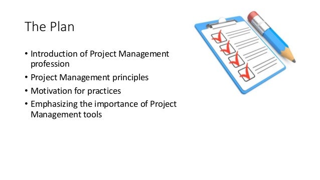 4. 4. The Plan • Introduction of Project Management profession • Project Management principles • Motivation for practices • Emphasizing the importance of Project Management tools