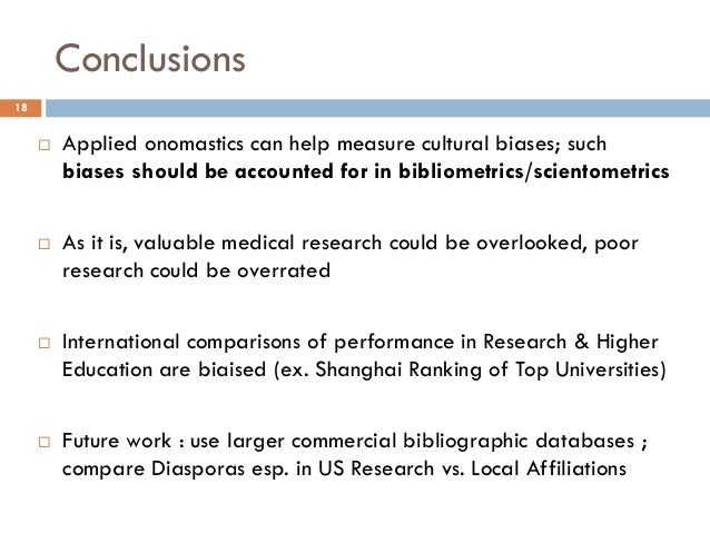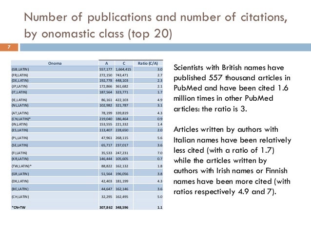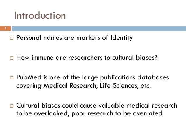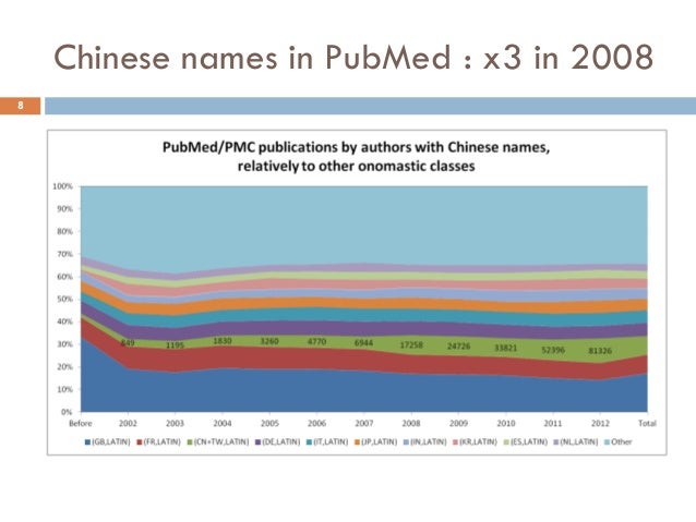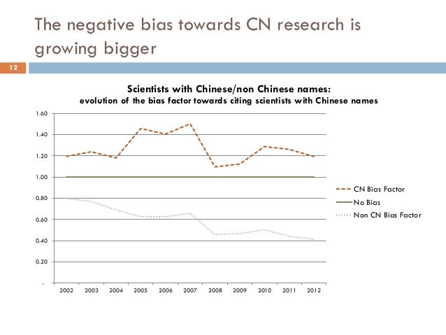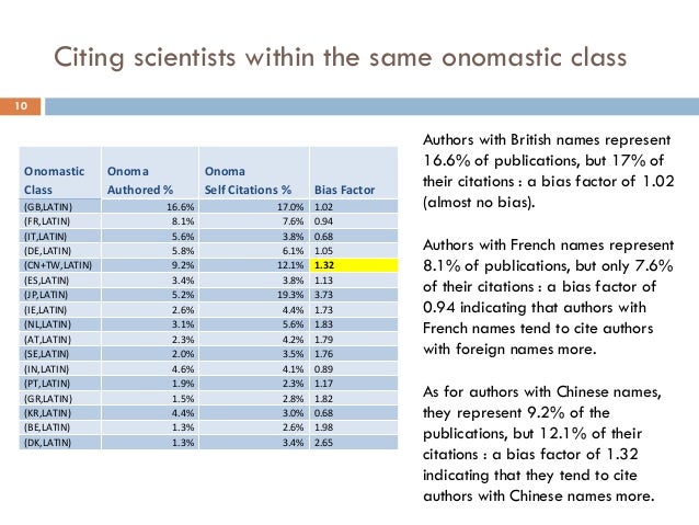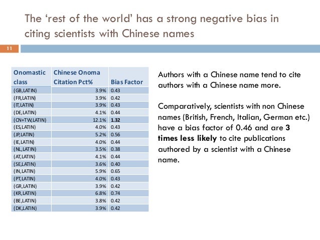 Presentation at ICOS2014, the premier conference in onomastics and name studies. This project involves the analysis of about over ten million medical research articles from PubMed. We propose to evaluate the correlation between the onomastic class of the article authors and that of the citation authors. We will demonstrate that the cultural bias exists and also that it evolves in time. Between 2007 and 2008, the ratio of articles authored by Chinese scientists (or scientists with Chinese names) nearly tripled. We will evaluate how fast this surge in Chinese research material (or research material produced by scientists of Chinese origin) became cross-referenced by other authors with Chinese or non-Chinese names. We hope to find that the onomastics provide a good enough estimation of the cultural bias of a research community.