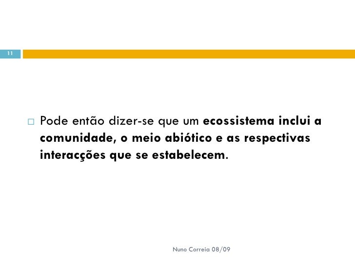 11. 11. 11  Pode então dizer-se que um ecossistema inclui a comunidade, o meio abiótico e as respectivas interacções que se estabelecem. Nuno Correia 08/09