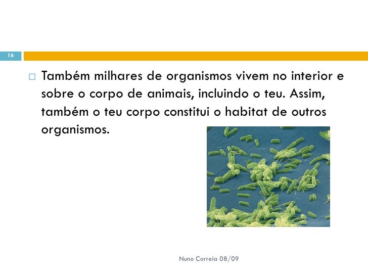 16. 16. 16  Também milhares de organismos vivem no interior e sobre o corpo de animais, incluindo o teu. Assim, também o teu corpo constitui o habitat de outros organismos. Nuno Correia 08/09