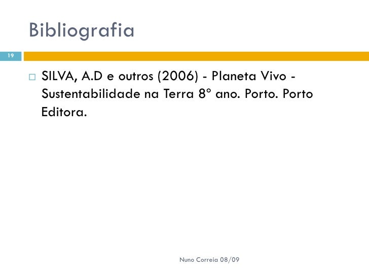 19. 19. Bibliografia 19  SILVA, A.D e outros (2006) - Planeta Vivo - Sustentabilidade na Terra 8º ano. Porto. Porto Editora. Nuno Correia 08/09