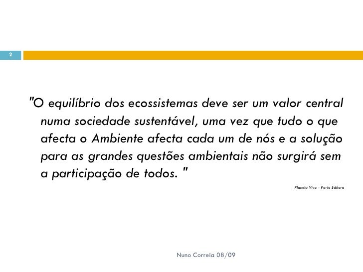 2. 2. 2 quot;O equilíbrio dos ecossistemas deve ser um valor central numa sociedade sustentável, uma vez que tudo o que afecta o Ambiente afecta cada um de nós e a solução para as grandes questões ambientais não surgirá sem a participação de todos. quot; Planeta Vivo - Porto Editora Nuno Correia 08/09