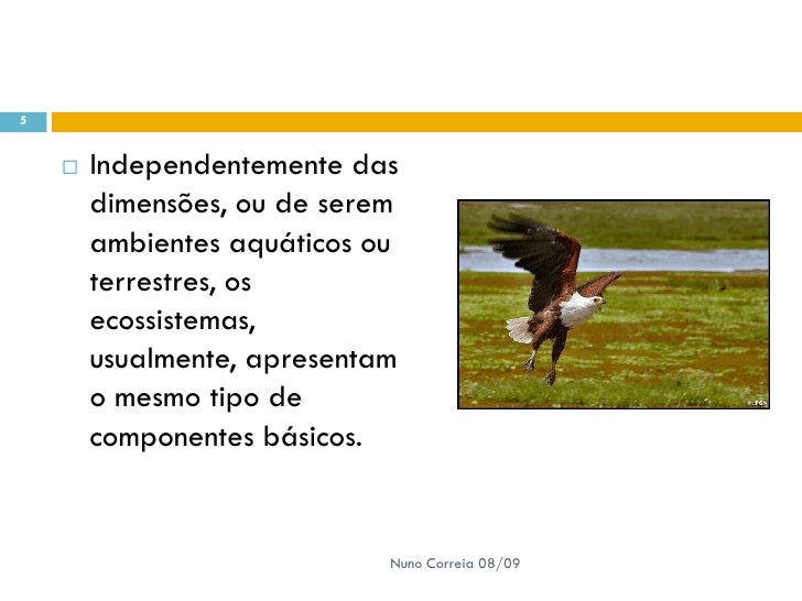 5. 5. 5  Independentemente das dimensões, ou de serem ambientes aquáticos ou terrestres, os ecossistemas, usualmente, apresentam o mesmo tipo de componentes básicos. Nuno Correia 08/09