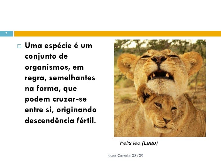 7. 7. 7  Uma espécie é um conjunto de organismos, em regra, semelhantes na forma, que podem cruzar-se entre si, originando descendência fértil. Felis leo (Leão) Nuno Correia 08/09