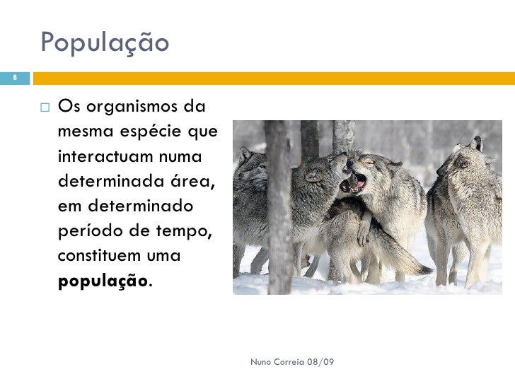 8. 8. População 8  Os organismos da mesma espécie que interactuam numa determinada área, em determinado período de tempo, constituem uma população. Nuno Correia 08/09