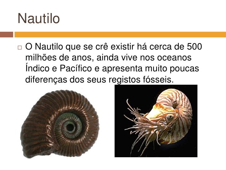 11. 11. Nautilo<br />O Nautiloque se crê existir há cerca de 500 milhões de anos, ainda vive nos oceanos Índico e Pacífico e apresenta muito poucas diferenças dos seus registos fósseis.<br />