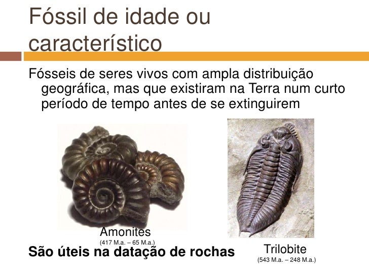 14. 14. Fóssil de idade ou característico<br />Fósseis de seres vivos com ampla distribuição geográfica, mas que existiram na Terra num curto período de tempo antes de se extinguirem<br />São úteis na datação de rochas<br />Amonites<br />(417 M.a. – 65 M.a.)<br />Trilobite<br />(543 M.a. – 248 M.a.)<br />