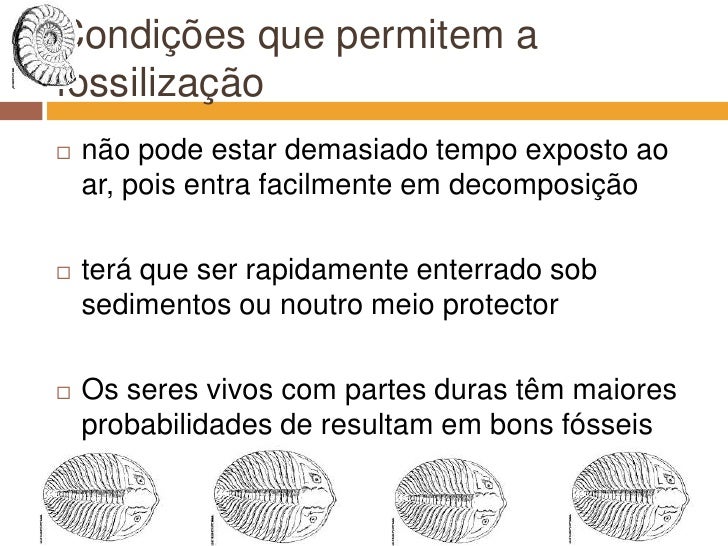 5. 5. Condições que permitem a fossilização<br />não pode estar demasiado tempo exposto ao ar, pois entra facilmente em decomposição<br />terá que ser rapidamente enterrado sob sedimentos ou noutro meio protector<br />Os seres vivos com partes duras têm maiores probabilidades de resultam em bons fósseis<br />