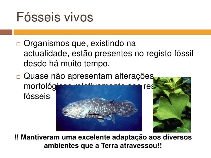 9. 9. Fósseis vivos<br />Organismos que, existindo na actualidade, estão presentes no registo fóssil desde há muito tempo.<br />Quase não apresentam alterações morfológicas relativamente aos respectivos fósseis<br />!! Mantiveram uma excelente adaptação aos diversos ambientes que a Terra atravessou!!<br />