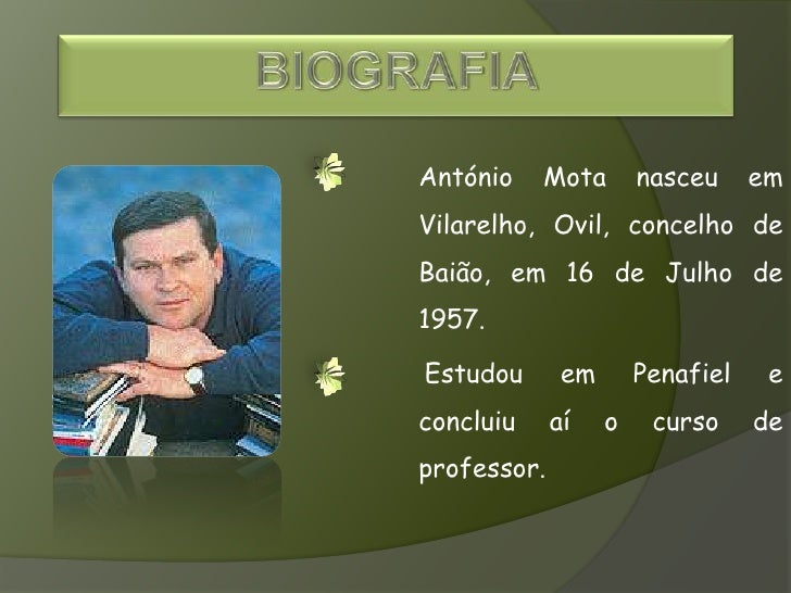 2. 2. BIOGRAFIA<br />António Mota nasceu em Vilarelho, Ovil, concelho de Baião, em 16 de Julho de 1957.<br />Estudou em Penafiel e concluiu aí o curso de professor. <br />