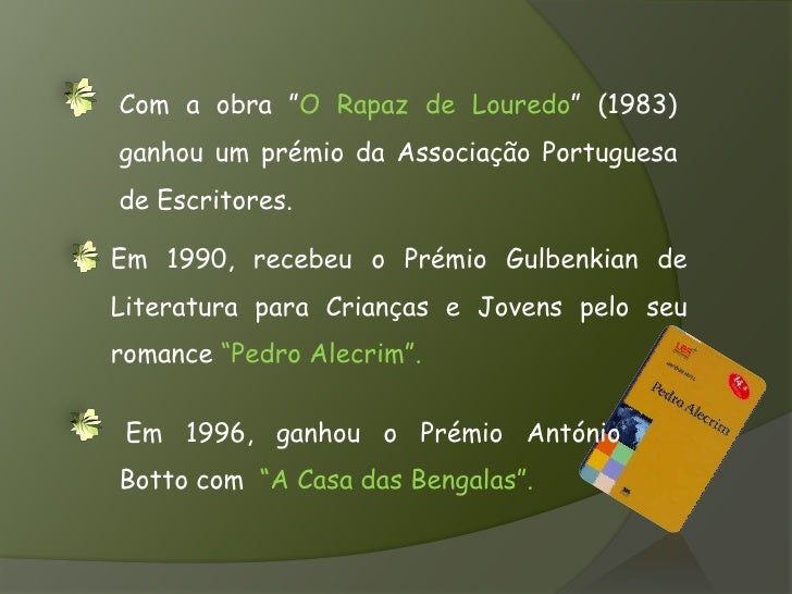 4. 4. Com a obra ”O Rapaz de Louredo” (1983) ganhou umprémio da Associação Portuguesa de Escritores. <br />Em 1990, recebeu o Prémio Gulbenkian de Literatura para Crianças e Jovens pelo seu romance “Pedro Alecrim”.<br />Em 1996, ganhou o Prémio António Botto com “A Casa das Bengalas”.<br />