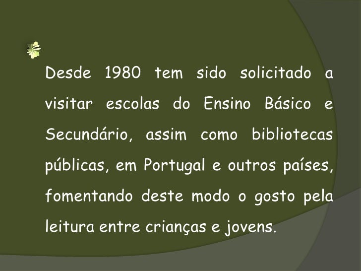 6. 6. Desde 1980 tem sido solicitado a visitar escolas do Ensino Básico e Secundário, assim como bibliotecas públicas, em Portugal e outros países, fomentando deste modo o gosto pela leitura entre crianças e jovens.<br />