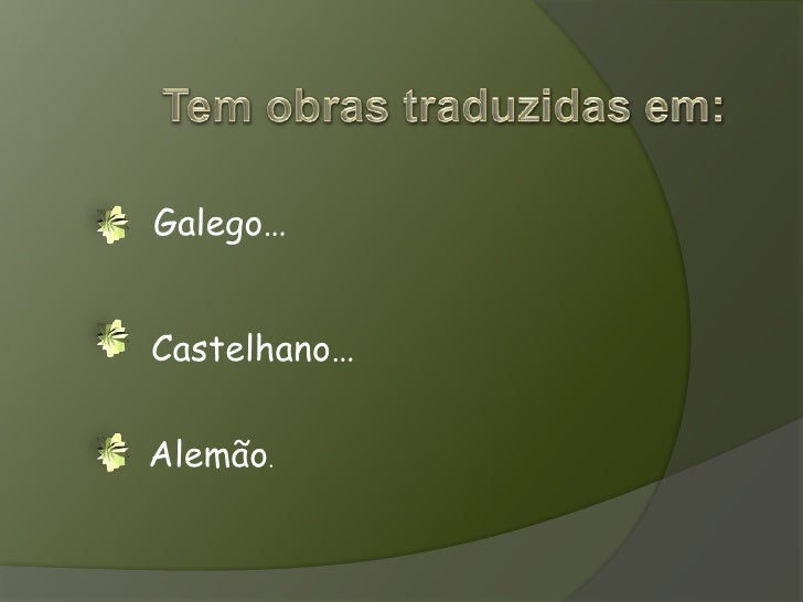 7. 7. Tem obras traduzidas em:<br />Galego…<br />Castelhano…<br />Alemão.<br />