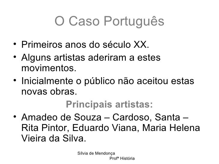 2. 2. O Caso Português <ul><li>Primeiros anos do século XX. </li></ul><ul><li>Alguns artistas aderiram a estes movimentos. </li></ul><ul><li>Inicialmente o público não aceitou estas novas obras. </li></ul><ul><li>Principais artistas: </li></ul><ul><li>Amadeo de Souza – Cardoso, Santa – Rita Pintor, Eduardo Viana, Maria Helena Vieira da Silva. </li></ul>Sílvia de Mendonça Profª História