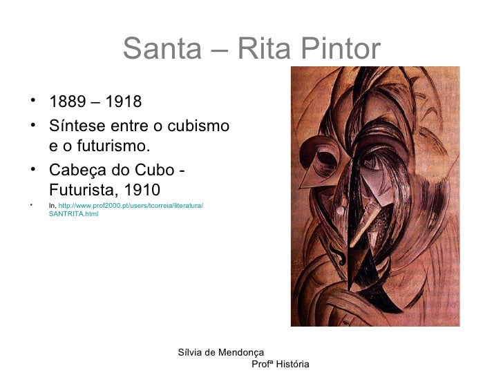 4. 4. Santa – Rita Pintor <ul><li>1889 – 1918 </li></ul><ul><li>Síntese entre o cubismo e o futurismo. </li></ul><ul><li>Cabeça do Cubo - Futurista, 1910 </li></ul><ul><li>In, http://www.prof2000.pt/ users / tcorreia /literatura/ SANTRITA.html </li></ul>Sílvia de Mendonça Profª História