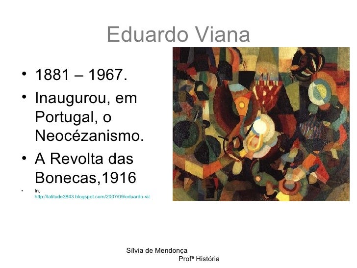 5. 5. Eduardo Viana <ul><li>1881 – 1967. </li></ul><ul><li>Inaugurou, em Portugal, o Neocézanismo. </li></ul><ul><li>A Revolta das Bonecas,1916 </li></ul><ul><li>In, http://latitude3843.blogspot.com/2007/09/eduardo-viana-revolta-das-bonecas-1916.html </li></ul>Sílvia de Mendonça Profª História