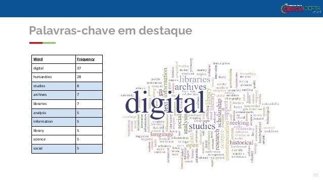 10. 10. Palavras-chave em destaque Word Frequency digital 37 humanities 28 studies 8 archives 7 libraries 7 analysis 5 information 5 library 5 science 5 social 5 10