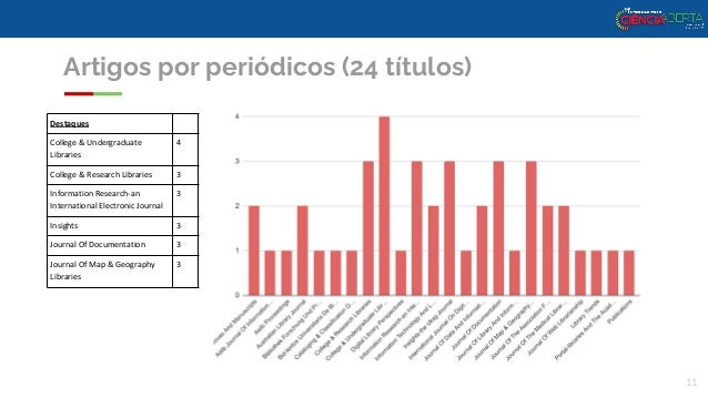 11. 11. Artigos por periódicos (24 títulos) Destaques College & Undergraduate Libraries 4 College & Research Libraries 3 Information Research-an International Electronic Journal 3 Insights 3 Journal Of Documentation 3 Journal Of Map & Geography Libraries 3 11