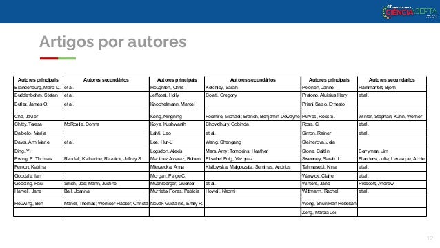 12. 12. Artigos por autores Autores principais Autores secundários Autores principais Autores secundários Autores principais Autores secundários Brandenburg, Marci D. et al. Houghton, Chris Ketchley, Sarah Polonen, Janne Hammarfelt, Bjorn Buddenbohm, Stefan et al. Jeffcoat, Holly Colati, Gregory Pratono, Aluisius Hery et al. Butler, James O. et al. Knochelmann, Marcel Priani Saiso, Ernesto Cha, Javier Kong, Ningning Fosmire, Michael; Branch, Benjamin Dewayne Purves, Ross S. Winter, Stephan; Kuhn, Werner Chitty, Teresa McRostie, Donna Koya, Kushwanth Chowdhury, Gobinda Ross, C. et al. Dalbello, Marija Lahti, Leo et al. Simon, Rainer et al. Davis, Ann Marie et al. Lee, Hur-Li Wang, Shengang Steinerova, Jela Ding, Yi Logsdon, Alexis Mars, Amy; Tompkins, Heather Stone, Caitlin Berryman, Jim Ewing, E. Thomas Randall, Katherine; Reznick, Jeffrey S. Martinez Alcaraz, Ruben Elisabet Puig, Vazquez Sweeney, Sarah J. Flanders, Julia; Levesque, Abbie Fenlon, Katrina Mierzecka, Anna Kisilowska, Malgorzata; Suminas, Andrius Tahmasebi, Nina et al. Goodale, Ian Morgan, Paige C. Warwick, Claire et al. Gooding, Paul Smith, Jos; Mann, Justine Muehlberger, Guenter et al. Winters, Jane Prescott, Andrew Harvell, Jane Ball, Joanna Murrieta-Flores, Patricia Howell, Naomi Wittmann, Rachel et al. Heuwing, Ben Mandl, Thomas; Womser-Hacker, Christa Novak Gustainis, Emily R. Wong, Shun Han Rebekah Zeng, Marcia Lei 12