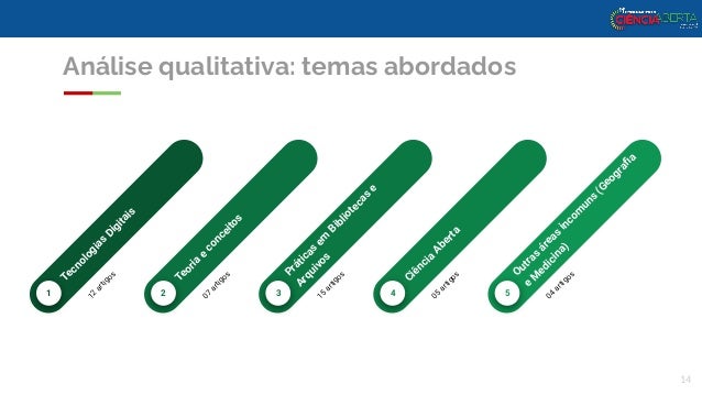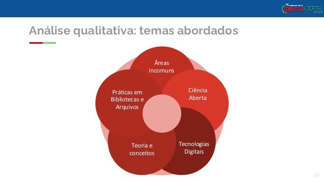 13. 13. Análise qualitativa: temas abordados 13 Áreas incomuns Ciência Aberta Tecnologias Digitais Teoria e conceitos Práticas em Bibliotecas e Arquivos