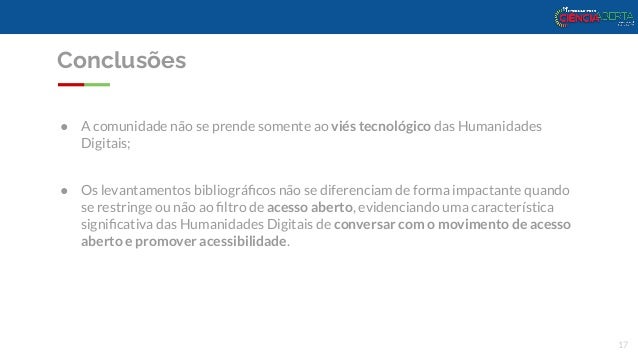 17. 17. Conclusões ● A comunidade não se prende somente ao viés tecnológico das Humanidades Digitais; ● Os levantamentos bibliográficos não se diferenciam de forma impactante quando se restringe ou não ao filtro de acesso aberto, evidenciando uma característica significativa das Humanidades Digitais de conversar com o movimento de acesso aberto e promover acessibilidade. 17