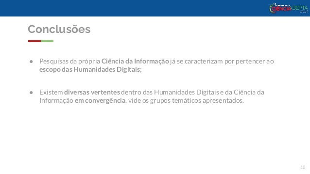 18. 18. Conclusões ● Pesquisas da própria Ciência da Informação já se caracterizam por pertencer ao escopo das Humanidades Digitais; ● Existem diversas vertentes dentro das Humanidades Digitais e da Ciência da Informação em convergência, vide os grupos temáticos apresentados. 18