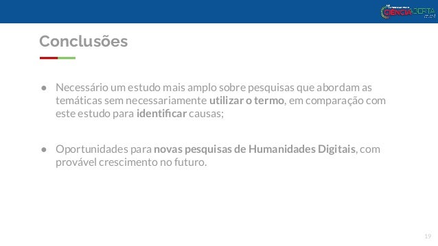 19. 19. Conclusões ● Necessário um estudo mais amplo sobre pesquisas que abordam as temáticas sem necessariamente utilizar o termo, em comparação com este estudo para identificar causas; ● Oportunidades para novas pesquisas de Humanidades Digitais, com provável crescimento no futuro. 19