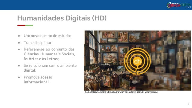 2. 2. ● Um novo campo de estudo; ● Transdisciplinar; ● Referem-se ao conjunto das Ciências Humanas e Sociais, às Artes e às Letras; ● Se relacionam com o ambiente digital; ● Promove acesso informacional. 2 Fonte: https://commons.wikimedia.org/wiki/File:Master_in_Digital_Humanities.png Humanidades Digitais (HD)
