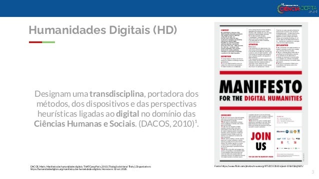 3. 3. Designam uma transdisciplina, portadora dos métodos, dos dispositivos e das perspectivas heurísticas ligadas ao digital no domínio das Ciências Humanas e Sociais. (DACOS, 2010)¹. Fonte: https://www.flickr.com/photos/revuesorg/4752155318/in/pool-1016926@N25/ Humanidades Digitais (HD) 3 DACOS, Marin. Manifesto das humanidades digitais. THATCamp Paris, 2010. [Tradução de Hervé Théry]. Disponível em: https://humanidadesdigitais.org/manifesto-das-humanidades-digitais/. Acesso em: 10 set. 2020.