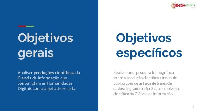 5. 5. 5 Objetivos gerais Analisar produções científicas da Ciência da Informação que contemplam as Humanidades Digitais como objeto de estudo. Objetivos específicos Realizar uma pesquisa bibliográfica sobre a produção científica através de publicações de artigos de bases de dados de grande referência no universo científico na Ciência da Informação.