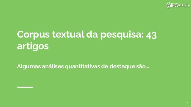 7. 7. Corpus textual da pesquisa: 43 artigos Algumas análises quantitativas de destaque são... 7