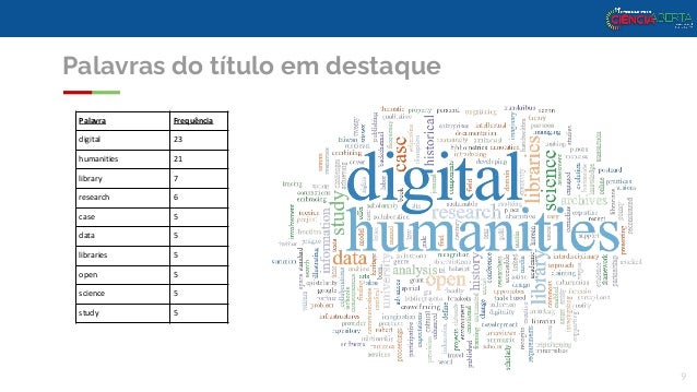 9. 9. Palavras do título em destaque Palavra Frequência digital 23 humanities 21 library 7 research 6 case 5 data 5 libraries 5 open 5 science 5 study 5 9