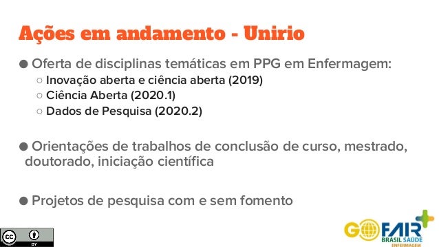 10. 10. Ações em andamento - Unirio ● Oferta de disciplinas temáticas em PPG em Enfermagem: ○ Inovação aberta e ciência aberta (2019) ○ Ciência Aberta (2020.1) ○ Dados de Pesquisa (2020.2) ● Orientações de trabalhos de conclusão de curso, mestrado, doutorado, iniciação científica ● Projetos de pesquisa com e sem fomento