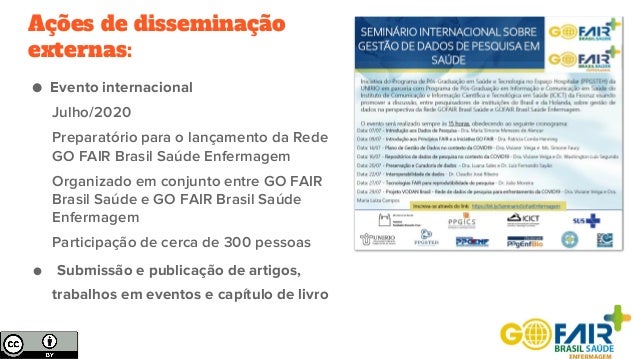 11. 11. Ações de disseminação externas: ● Evento internacional Julho/2020 Preparatório para o lançamento da Rede GO FAIR Brasil Saúde Enfermagem Organizado em conjunto entre GO FAIR Brasil Saúde e GO FAIR Brasil Saúde Enfermagem Participação de cerca de 300 pessoas ● Submissão e publicação de artigos, trabalhos em eventos e capítulo de livro