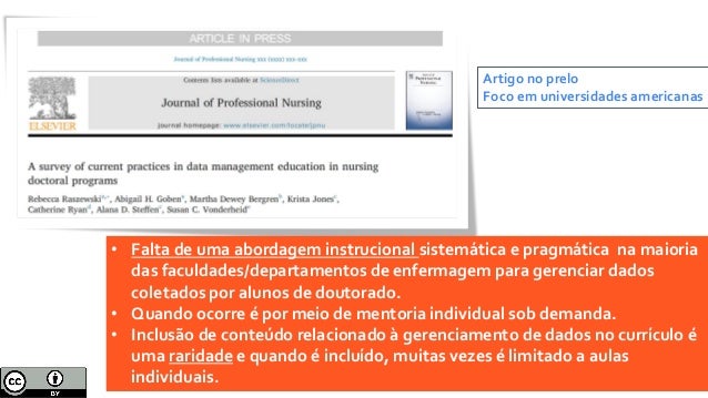 14. 14. • Falta de uma abordagem instrucional sistemática e pragmática na maioria das faculdades/departamentos de enfermagem para gerenciar dados coletados por alunos de doutorado. • Quando ocorre é por meio de mentoria individual sob demanda. • Inclusão de conteúdo relacionado à gerenciamento de dados no currículo é uma raridade e quando é incluído, muitas vezes é limitado a aulas individuais. Artigo no prelo Foco em universidades americanas