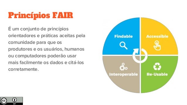 2. 2. Princípios FAIR É um conjunto de princípios orientadores e práticas aceitas pela comunidade para que os produtores e os usuários, humanos ou computadores poderão usar mais facilmente os dados e citá-los corretamente.
