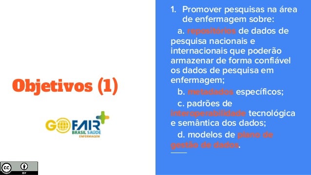 7. 7. Objetivos (1) 1. Promover pesquisas na área de enfermagem sobre: a. repositórios de dados de pesquisa nacionais e internacionais que poderão armazenar de forma confiável os dados de pesquisa em enfermagem; b. metadados específicos; c. padrões de interoperabilidade tecnológica e semântica dos dados; d. modelos de plano de gestão de dados.