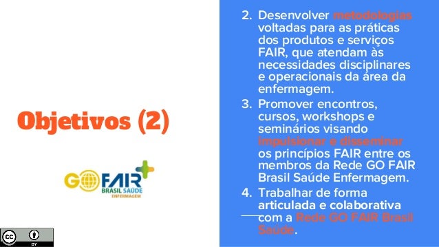 9. 9. Objetivos (2) 2. Desenvolver metodologias voltadas para as práticas dos produtos e serviços FAIR, que atendam às necessidades disciplinares e operacionais da área da enfermagem. 3. Promover encontros, cursos, workshops e seminários visando impulsionar e disseminar os princípios FAIR entre os membros da Rede GO FAIR Brasil Saúde Enfermagem. 4. Trabalhar de forma articulada e colaborativa com a Rede GO FAIR Brasil Saúde.