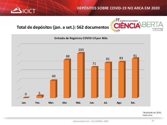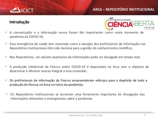 10. 10. 10Apresentação Arca – 11a. CONFOA - 2020 ARCA – REPOSITÓRIO INSTITUCIONAL  Os Repositórios Institucionais se tornaram uma ferramenta importante de divulgação das informações relevantes e emergenciais sobre a pandemia. Introdução  A comunicação e a informação nunca foram tão importantes como neste momento de pandemia da COVID-19;  Essa emergência de saúde tem mostrado como a atuação dos profissionais de informação nos Repositórios Institucionais têm sido decisiva para a gestão do conhecimento científico;  Nos Repositórios, um volume expressivo de informações pode ser divulgado em tempo real;  A produção intelectual da Fiocruz sobre COVID-19 é depositada no Arca com o objetivo de disseminar e oferecer acesso integral a esse conteúdo;  Os profissionais de informação da Fiocruz empreenderam esforços para o depósito de toda a produção da Fiocruz no Arca no início da pandemia;