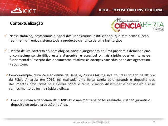11. 11. 11Apresentação Arca – 11a. CONFOA - 2020 ARCA – REPOSITÓRIO INSTITUCIONAL  Nesse trabalho, destacamos o papel dos Repositórios Institucionais, que tem como função reunir em um único sistema toda a produção científica de uma Instituição;  Dentro de um contexto epidemiológico, onde o surgimento de uma pandemia demanda que o conhecimento científico esteja disponível e acessível o mais rápido possível, torna-se fundamental a inserção dos documentos relativos às doenças causadas por estes agentes no Repositório; Como exemplo, durante a epidemia da Dengue, Zika e Chikungunya no Brasil no ano de 2016 e da Febre Amarela em 2019, foi realizada uma força tarefa para garantir o depósito dos documentos produzidos pela Fiocruz sobre o tema, visando disseminar e dar acesso a esse conhecimento de forma rápida e eficaz; Contextualização  Em 2020, com a pandemia da COVID-19 o mesmo trabalho foi realizado, visando garantir o depósito de toda a produção no Arca.