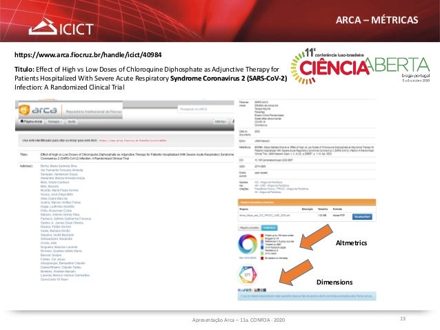13. 13. 13Apresentação Arca – 11a. CONFOA - 2020 ARCA – MÉTRICAS https://www.arca.fiocruz.br/handle/icict/40984 Titulo: Effect of High vs Low Doses of Chloroquine Diphosphate as Adjunctive Therapy for Patients Hospitalized With Severe Acute Respiratory Syndrome Coronavirus 2 (SARS-CoV-2) Infection: A Randomized Clinical Trial Altmetrics Dimensions