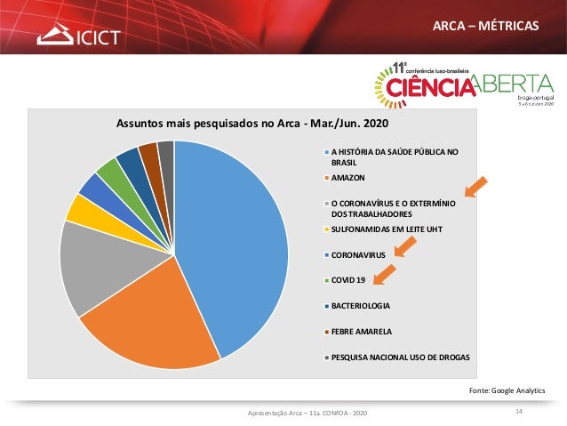 14. 14. 14Apresentação Arca – 11a. CONFOA - 2020 ARCA – MÉTRICAS Assuntos mais pesquisados no Arca - Mar./Jun. 2020 A HISTÓRIA DA SAÚDE PÚBLICA NO BRASIL AMAZON O CORONAVÍRUS E O EXTERMÍNIO DOS TRABALHADORES SULFONAMIDAS EM LEITE UHT CORONAVIRUS COVID 19 BACTERIOLOGIA FEBRE AMARELA PESQUISA NACIONAL USO DE DROGAS Fonte: Google Analytics