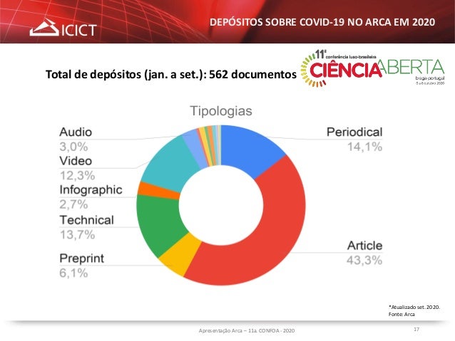 16. 16. 16 DEPÓSITOS SOBRE COVID-19 NO ARCA EM 2020 Apresentação Arca – 11a. CONFOA - 2020 *Atualizado set. 2020. Fonte: Arca Total de depósitos (jan. a set.): 562 documentos Jan. Fev. Mar. Abr. Mai. Jun. Jul. Ago. Set. 0 5 40 88 103 71 81 83 91 Entrada de Registros COVID-19 por Mês