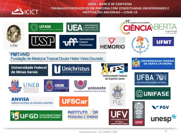 18. 18. 18 ARCA – BANCO DE CIENTISTAS TRABALHOS PRODUZIDOS EM PARCERIA COM CONCEITUADAS UNIVERSIDADES E INSTITUIÇÕES NACIONAIS – COVID-19 Apresentação Arca – 11a. CONFOA - 2020