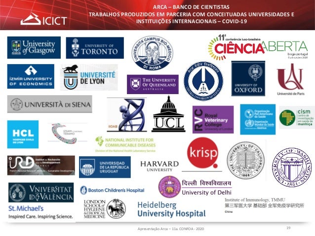 19. 19. 19Apresentação Arca – 11a. CONFOA - 2020 ARCA – BANCO DE CIENTISTAS TRABALHOS PRODUZIDOS EM PARCERIA COM CONCEITUADAS UNIVERSIDADES E INSTITUIÇÕES INTERNACIONAIS – COVID-19