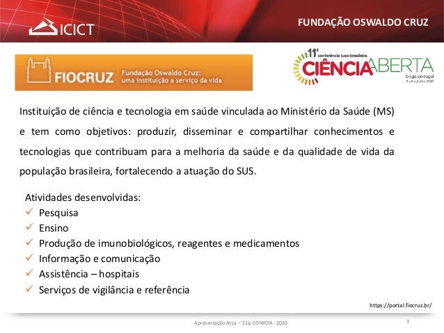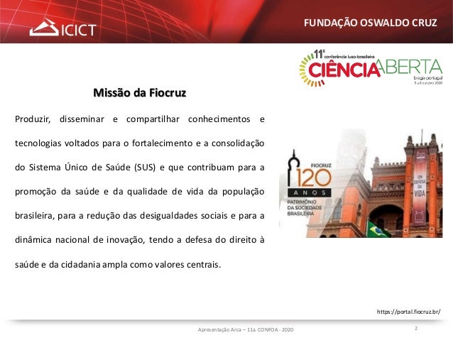 2. 2. 2Apresentação Arca – 11a. CONFOA - 2020 FUNDAÇÃO OSWALDO CRUZ https://portal.fiocruz.br/ Missão da Fiocruz Produzir, disseminar e compartilhar conhecimentos e tecnologias voltados para o fortalecimento e a consolidação do Sistema Único de Saúde (SUS) e que contribuam para a promoção da saúde e da qualidade de vida da população brasileira, para a redução das desigualdades sociais e para a dinâmica nacional de inovação, tendo a defesa do direito à saúde e da cidadania ampla como valores centrais.