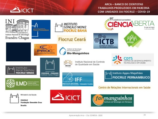 20. 20. 20Apresentação Arca – 11a. CONFOA - 2020 ARCA – BANCO DE CIENTISTAS TRABALHOS PRODUZIDOS EM PARCERIA COM UNIDADES DA FIOCRUZ – COVID-19