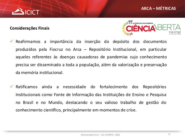 21. 21. 21Apresentação Arca – 11a. CONFOA - 2020 ARCA – MÉTRICAS  Ratificamos ainda a necessidade do fortalecimento dos Repositórios Institucionais como Fonte de Informação das Instituições de Ensino e Pesquisa no Brasil e no Mundo, destacando o seu valioso trabalho de gestão do conhecimento científico, principalmente em momentos de crise. Considerações Finais  Reafirmamos a importância da inserção do depósito dos documentos produzidos pela Fiocruz no Arca – Repositório Institucional, em particular aqueles referentes às doenças causadoras de pandemias cujo conhecimento precisa ser disseminado a toda a população, além da valorização e preservação da memória institucional.